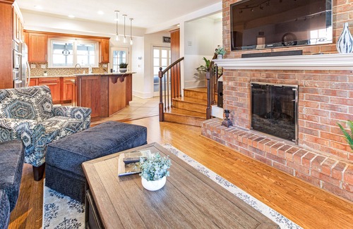 Heading inside you'll find that the first floor boasts with space, stunning hardwood flooring, and charming furnishings that create a homey feel. The main gathering room consists of large, plush, crushed velvet sofas that face an original brick fireplace and flat screen television. This space also opens up to the breakfast nook, a meticulously renovated kitchen, and a powder room. The kitchen is equipped with high-end stainless steel appliances, granite countertops, and fully stocked with everything needed to prepare home cooked meals. There is also a large pantry that offers an ample amount of space to store all of your provisions, in addition to a spacious laundry room just off of the kitchen.