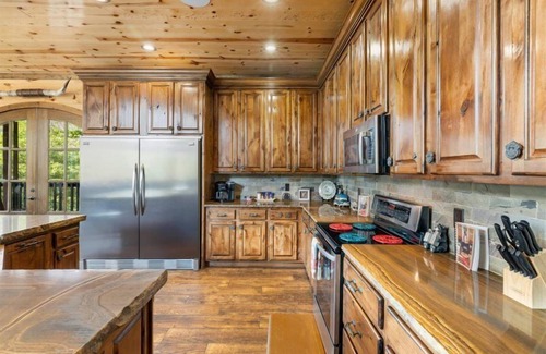 The Majestic Mountain Lodge now has a Tesla charger and is the crown jewel of Beavers Bend Resort area located conveniently only a couple of minutes from the main entrance to Broken Bow Lake and Beavers Bend State Park in one of the favorite locations in Timber Creek Trails South. This wonderfully built cabin is pure architectural splendor with its floor to vaulted ceiling windowed walls, tin covered interior ceilings, beautiful master custom shower and an attached private 1-bedroom suite makes it a cut above the rest! This beautiful lodge has amenities galore… relax in the soothing, warm temperatures of the two large hot tubs or get steamy in the master custom walk-in shower… The kitchen is a cook's dream, which offers the chef in your life a chance to be creative and test one’s skills and have plenty of room in the extra-large refrigerator to store all of your creations for a late-night snack. There are 5 king bedrooms in the main cabin and 6th bedroom in the attached private mother-in-law suite. There is also plenty of extra sleeping in the game room featuring 8 bunk beds, a trundle bed, and a full-size bed. The attached mother-in-law suite has a blow up bed and the downstairs Master in the main cabin has a pull-out sofa, making this cabin enjoyable for up to 28 guests! The expansive decks have 2 large hot tubs on bottom and top level with views of the many star-filled Oklahoma skies. Enjoy the family time around the fire pit or a fun game of horseshoes or take off to Beavers Bend State Park or Broken Bow Lake where you will find many hiking trails, fishing, boating, horseback riding, zip lining, and a host of other outdoor activities. Majestic Mountain Lodge is sure to become your favorite “home away from home."