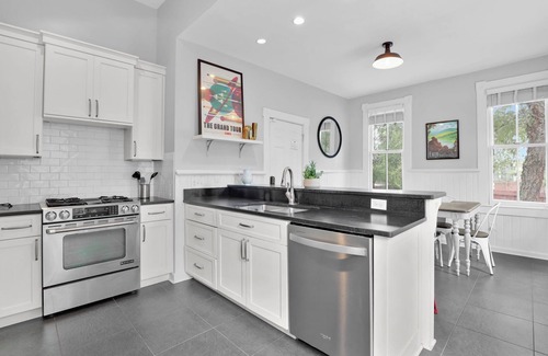 All three bedrooms and two full baths are located on the second floor, providing a serene escape for a restful night. The first bedroom features a Queen bed, antique writing desk, and full-sized closet. The middle bedroom is perfect for kids or friends, with a Full-size bed and a Twin bed with trundle. The primary suite, facing Price Street, offers a King-size bed and large Smart TV. The upstairs bathrooms bookend the hall, one with a tub/shower combo and the other with a standing shower.