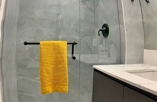 The bathroom has a frameless glass shower with a rain shower head. We supply shampoo, conditioner, and body lotion. We have added a bidet to the toilet as well, got to be fresh and clean.