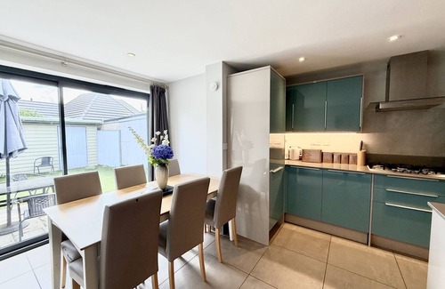 The open-plan kitchen/diner combines style, functionality, and elegance. Striking teal cabinets add a vibrant pop of color, and a spacious island ,offers additional counter space and a gathering spot. The kitchen features integrated appliances, including an electric oven, gas hob, full-size fridge/freezer, and dishwasher. The dining area, adjacent to the kitchen, comfortably accommodates up to six guests, with stylish upholstered seats ensuring comfort.