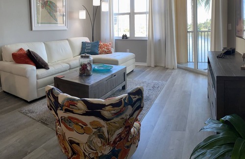 Welcome to Marina Breeze, a totally renovated 2nd Floor Unit 2203 Waterfront Condo with two king bedrooms, two full baths. Heated pool steps away, Several indoor and outdoor waterfront restaurants within walking distance. Relax on the comfortable lanai watching manatee, dolphins, birds and boats. Always a breeze. Condo has dining for four+four, spacious seating on the new white leather sectional with large screen TV. Additional TV in master bedroom with adjustable king size bed. Short distance to Punta Gorda and surrounding areas waterfront dining and attractions. There is also golf, tennis, gym and pickle ball available. Several boat tours to surrounding islands are available at Burnt Store Marina along with bike rentals at the trading store. Now offering Golf cart rental only to documented visitors at Marina Breeze, ask for details!