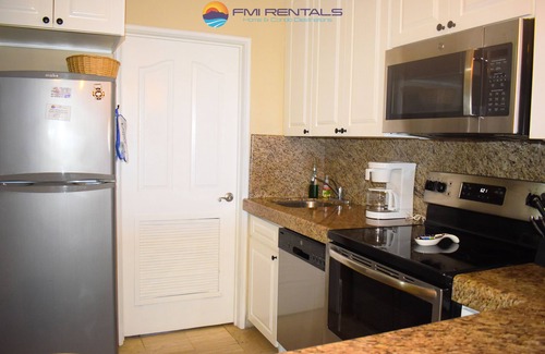 There is plenty of living space in this condo. Bright, naturally lit rooms have lots of comfortable seating, especially in the living room, which has a spacious sofa and loveseat with lots of fluffy pillows. The dining area is a great gathering spot, with leather bound dining chairs to seat 4 and a wood dining table for eating around.