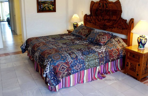 Come enjoy Mexico in this 2 level, 3 bedroom/2 1/2 bath condo located on the third floor of the Plaza Glorias/Marina Terra complex. With its bright colors and beautiful views, you’ll know you are south of the border! The condo and balconies have great views down to the pool/garden area and out to the marina, Tetas, and sunsets. The upstairs has 2 bedrooms. each with its own ensuite bathroom. The master, with king bed, has its own balcony. The second bedroom has 2 twins which can be made up as a king. The lower floor has a den with a bunkbed set. The main level also has a fully equipped kitchen, living and dining areas , laundry, a ½ bath, and a balcony. The couch in the livingroom is a hidabed. Good internet service is available. Condo 310 will sleep 6 adults and 2 children—perfect for 2 couples or families.