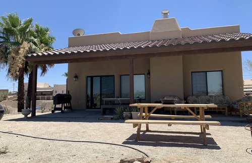 This is a newer southwestern style house with central air conditioning, washer/dryer, free wi-fi, smart TV, and more. It is 3 bedrooms, 2 bathrooms with a huge great room that includes a 6 person dining table, high end granite/stainless steal kitchen, dry bar, fireplace and more. This property is over 1/2 an acre with unequaled lake and desert views. The secluded dock is located on the south end of Martinez Lake and is shared with the adjacent house. It is a quick walk down to the dock and the shared 350 square foot deck, cantilevered out over the water.