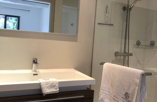 - A bedroom with garden view (20m²) with a queen-size bed (160) and an adjoining bathroom (double sink, shower, bath and toilet).