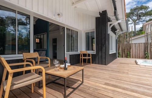 Very modern, beautiful, comfortable single-family house "Massawipi Lodge". In the district of La Grande Escoure, in the resort 7 km from the centre of Lacanau Océan, 7 km from the sea, 100 m from the lake, 100 m from the beach. Private: well-kept garden 350 m2 (fenced) with lawn and wildlife garden. Barbecue. In the house: hot tub. Parking (for 2 cars). E-charging station. Shop 7 km, supermarket 8 km, restaurant 150 m, bus stop "La Grande Escoure" 180 m, sandy beach "Lacanau Océan" 7 km, bathing lake "La Grand Escoure" 100 m. Golf course (18 hole) 6 km, surf school 7 km, sailing school 150 m, indoor tennis centre 7 km. Nearby attractions: Dune du Pilat 80 km, Cap Ferret 48 km, Bordeaux 66 km, Saint Emilion 114 km. Well-known lakes can easily be reached: Moutchic 100 m, Maubuisson 19 km. The keys‘ handover takes place by the agency Interhome in Lacanau, 8 km.