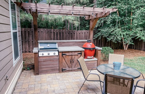 We have an open concept kitchen/dining/living room for entertaining. There are 4 bedrooms and 3 bathrooms. The master bedroom has a king bed and adjoining master bathroom. Two guest rooms have a full/queen beds with a nearby full bath. There is also a large bonus room that has 1 queen bed and an adjoining full bath. The back yard has a screened in patio with a fire table and plenty of seating. There is also a gas grill and charcoal grill. Our house is also conveniently located near the Greeneway (A nice walking/biking trail that runs from our neighborhood to the Savannah River).