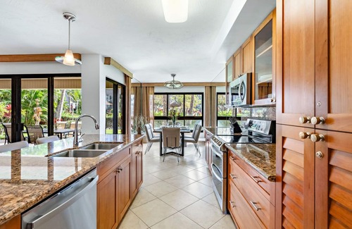Luxuriously remodeled, this 2 bedroom den ground-floor gem delivers partial ocean views, an expansive 1850 sq ft of interior living area, and a sleeping capacity of up to 8 guests. The oversized outdoor living space and lawn area effectively doubles your lanai (balcony), making it the largest outdoor lanai on offer at the resort.