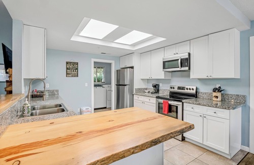 Walk back down the hall and through the family room to the kitchen and dining area with island and bar. The newly remodeled kitchen has everything you'll need for preparing and serving home-style to gourmet meals. Through the main kitchen, find the laundry room equipped with a washer and dryer.