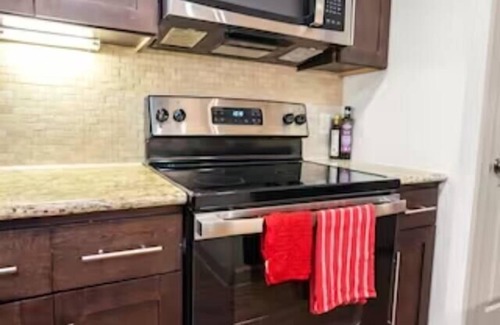 Experience your peaceful escape in this spacious one-bedroom, one-bathroom retreat nestled in a friendly neighborhood. Enjoy the comfort of a plush king-sized bed for a rejuvenating sleep and relax in the open-concept living area, offering ample space to unwind. The fully equipped kitchen is ready for your culinary adventures, making home-cooked meals a breeze. Step out onto your private patio, perfect for enjoying coffee or drinks in a serene setting.