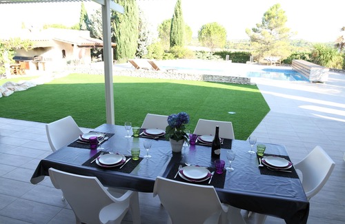 The kitchen is fully equipped and leads directly to the covered terrace which has space for all the guests to spend those long, leisurely mealtimes together which are so much part of the southern French way of life. There is a separate covered barbecue area with additional table space and bar where you can spend your evenings eating delicious local produce as you watch the bbq embers fade along with the sunset.