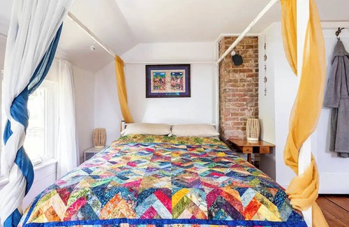 This beautiful historic home, built in 1890, has all the charm of an older farmhouse with all the comforts of modernity! Original pine floors & exposed brick and beams meets all new appliances, including a brand new stove/oven, washer/dryer in one, cast iron gas fireplace, fridge and much more. A record player, TV, stereo, wifi, full (in tune!) piano in living room and Nespresso and gourmet teas in kitchen. Upstairs, you'll find a romantic canopy queen bed, reading nook and blackout curtains. River views on both floors, huge yard, fire pit, hammock, & close to tons of local hiking, shopping, food/drink. Come romance yourself or your partner or small family in this restorative oasis, 2 minutes from Kingston.