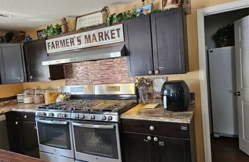 Big open floor plan of living room, dining room and Big kitchen with 2 gas stoves and 2 side by side refrigerators. Dining room table seats 10 people. There is a 1\2 bathroom down stairs. Bedroom 1 has 2 full beds. Bedroom 2 has 1 queen bed. Bedroom 3 has to full bed with its own bathroom. Bedroom 1 & 2 share a bathroom in the hall way.