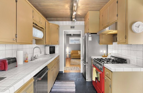 A few Minutes from the downtown night life. This vintage beauty has a signature 1960's vibe with a modern feel (think Mad Men.) Custom vintage upscale furniture for you and your family to enjoy, lush leather couch, 70-inch flat screen with Netflix. Our home features wood beam ceilings and custom lighting, floor to ceiling windows in the main living space, with a stocked kitchen and a chef's dream Bertazzoni gas range. Enjoy a full nights sleep on the dreamcloud mattresses. Pet friendly.