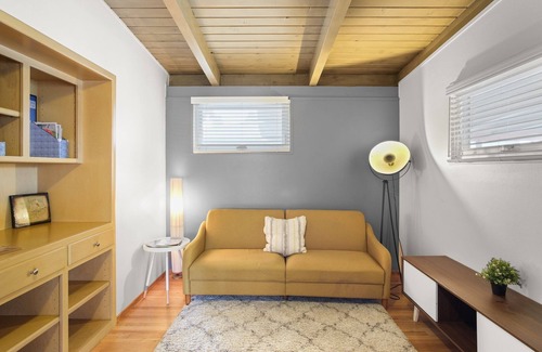 Just a few minutes from the downtown night life. This vintage beauty has a signature 1950s retro vibe with a modern feel. Custom vintage upscale furniture for you and your family to enjoy, deep lush leather couch, 70 inch flat screen with Netflix. Our home features wood beam ceilings with custom lighting, floor to ceiling windows in living space, with a fully-stocked kitchen and a chef's dream Bertazzoni gas range. Enjoy a full nights sleep in the lux dream cloud mattresses. We're also pet-friendly!