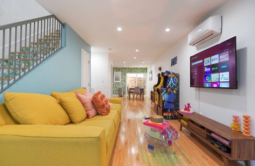 This home was tastefully decorated with the mid century modern theme in mind. Home is fully furnished, fully stocked with kitchen appliances and items for you to cook at home. Home is walking distance from downtown Santa Ana, courts, museum, etc. Arcade games add a bit of nostalgia and the large 4K smart TVs allow for relaxing stay.