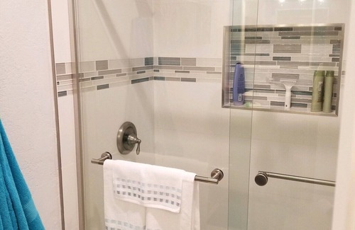Completely remodeled....modern appliances and a wet bar with wine cooler. Mid century decor. Private balcony and minutes to down town. Quiet gated community with multiple pools, jacuzzis, putting green. Non-smoking unit. Quiet, safe community, gated with security, first level walk out with small patio. There is a communal laundry facility on site near unit.