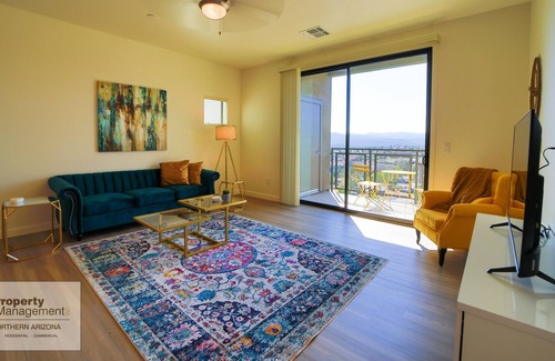Midnight Merlot is a great central location for exploring Prescott and the surrounding areas. This beautiful two bedroom, two bathroom apartment is located in a beautiful complex with all the amenities for a great vacation. The apartment has everything you'll need for a short trip or extended stay. Enjoy a cozy movie night in on the sofa after a long day of exploring or enjoy the sunset with gorgeous views of the Bradshaw Mountain Range. Midnight Merlot provides small town vibes with luxury comfort and big city conveniences. The property amenities include a heated pool and jacuzzi, poolside Ramada with outdoor TV and grill area and pet area. Just minutes from Lynx Lake, Granite Dells and Historic Downtown Prescott you'll never be far from an adventure.