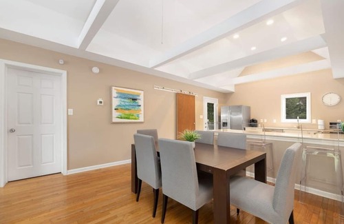 Prepare a tasty meal while interacting with your friends and family in the open style common area. The kitchen is stocked with stainless steel appliances, toaster oven, pots/pans, plates/bowls & utensils, everything you need. The large dining room table is the perfect place to sit down and enjoy a meal together.