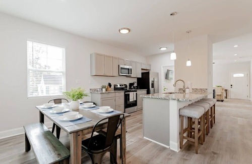 This brand new home is located in the historic neighborhood, Elmwood Park. It offers a modern stay in a charming district. Stacked front porches, ample living space, fully-equipped kitchen, 4 bedrooms, 3 bathrooms, space to sleep 16 guests - what could be better? Enjoy an easy walk to local shops and restaurant, Main Street is only 2 blocks away! Less than 2 miles from downtown and USC, about 20 minutes from Fort Jackson. Free WiFi and pet friendly with a fee. We would love to host you!