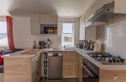 Discover this modern mobile home (2023) at Camping du Littoral in Ambon, a 3-star establishment ideally located just 1.4 km from the beach. Perfect for vacations with family or friends, it can accommodate up to 6 people thanks to its three bedrooms: one with a double bed, and two with 80 cm single beds.