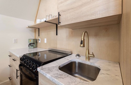 This A-frame has one bedroom and one bathroom on the first floor. The modern spiral staircase leads up to a second floor lofted sleeping area. Enjoy a cozy wood fire inside or soak up the sounds of nature on the back deck while relaxing in the 7 person hot tub.