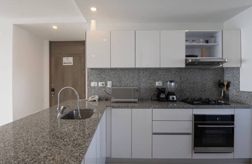 Exclusive beachfront apartment with hotel-like services located in the vibrant Bocagrande neighborhood, steps away from restaurants cafes and shops, and a 3 minute drive away from the Old City. This home features 2 bedrooms, 2 bathrooms, comfortable living room, fully equipped kitchen, spacious balcony overlooking the sea and the city, Cable TV and Wi-fi. The building offers an infinity pool, jacuzzi, gym and co-working space. Guests receive complimentary access to our Elite Concierge service.