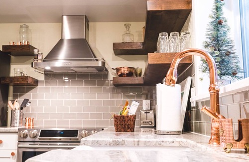 This basement apartment is separated from our upstairs, there is a garage entrance in the back of the house. It is completely updated throughout. Nice large living area with two couches and a TV. Wood burning stove by the kitchen table. Super cute modern kitchen with all the needed amenities to have great meals at home. New front loading washer and dryer.