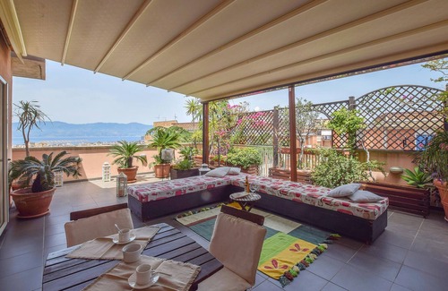 Enjoy a wonderful stay in this penthouse apartment with its large, covered terrace and wonderful sea view in Reggio Calabria and explore the interesting nature and culinary specialties of Calabria. Start the day with a good breakfast and beautiful views from the kitchen. After your excursions in the area, you can settle down on comfortable sofas, watch a movie together or review your experiences together.