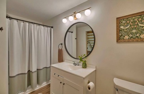 Downstairs there is a twin sized day bed with a trundle that doubles as your couch, a wingback chair, electric fireplace, a kitchenette, and a hammock chair to swing, relax and recharge! There's a dining area with a bird nest themed seating for two and there's a brand new modern bathroom with updated lighting, mirror, and stand up shower with complimentary Trader Joe's shampoo, conditioner and body wash! In the living room there is also an HD TV with Roku set to guest mode for log-in to your own streaming services. We do not have cable TV in the nest.