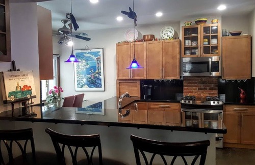 Fully equipped chef's kitchen with granite & stainless. Spacious bedroom w/ king sized and very comfortable bed. High speed internet that can be hardwired for work at home. HD flat screened TV with Hulu Live, Netflix, and Amazon Prime). Desk/office space with extra computer monitor. Breakfast nook. Living room with new leather furniture. Sitting alcove. Kitchen. Counter bar with stools. Outdoor space with patio seating overlooks tree lined yard.