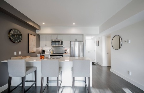 Relax in our modern and clean condo nestled on a forested Muskoka hillside. This 2 bedroom newly built (2019) condo, with underfloor heating throughout is the perfect city getaway, 2.5 hours from downtown Toronto. Our home offers the convenience of fibre internet; reliable to keep you connected to work or stream your favourite Netflix show. Explore Huntsville's year round beauty, with nearby Arrowhead and Algonquin parks. Deerhurst resort restaurants, golf and spa are just steps away.