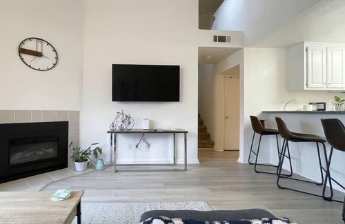 Enjoy the bright and open concept living room, which includes a 55 inch television. Wifi is fast to support all of your work and entertainment needs. The full kitchen includes a new dishwasher, complete sets of dining and cutlery, a modern dining table and comfortable chairs. The bedrooms are finished with simplistic design in mind. Reading lamps, unique art and real plants are added throughout. The upstairs master and downstairs bedroom include large, comfortable Queen beds with a new mattress. Both bathrooms include a full shower/ tub combination and lots of counter space and storage. The central air system is updated with smart technology and the washer and dryer set is brand new.