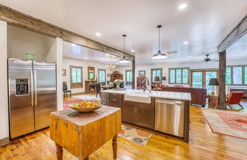 As you enter this warm and welcoming one level home you’re immediately taken by the original restored floors, beams, and windows...so unique! The open floor plan and bright interior with comfortable furnishings and family heirlooms beckon you to settle in. This home boasts; 3 king bedrooms each with private modern en-suite bath with walk in shower, half bath, laundry room, pool table and game area, great room with seating for all and dining area that accommodates 6 plus comfortably. The fully outfitted bright open kitchen invites you to cancel your dinner reservations to stay in. Gather on the back deck which abuts a year round audible creek to enjoy a meal, or sit around the fire table to review the day...so peaceful. After a day of exploring all Asheville and the surrounding area has to offer, sleep soundly on comfy beds with loads of pillows and luxury bedding. So settle in to enjoy the serenity, nature, and everyone's company!