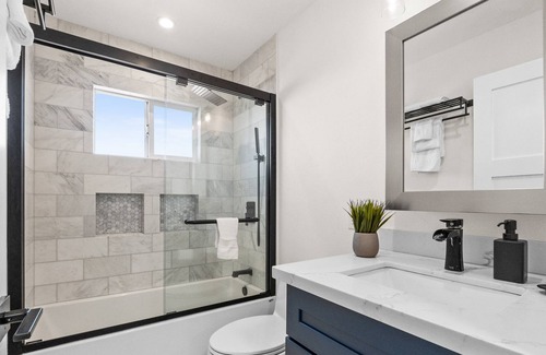 With two pristine bathrooms, mornings and evenings are a breeze. The master bathroom features a modern shower, while the second bathroom offers a tub-shower combination. Both bathrooms are well-appointed with fresh towels and essential toiletries.