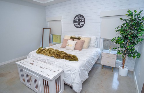The Modern Farmhouse consists of three to four separate sleeping areas, the upstairs Loft, Two Private Bedrooms and fold out couch downstairs. The upstairs loft is furnished with a Queen Bed and a Twin over Full size Bunk Bed. The loft comes with TV where you can watch Hulu Live, Netflix and Prime Video. You have a sound machine, ear plugs and an eye mask for your use if desired. You have your own beverage stocked mini- fridge and freezer, and bathroom essentials when traveling in case you forget anything during your stay. You have your own thermostat upstairs separate from the rest of the house. The first downstairs private bedroom is the Master wing of the house (when you walk in the room you'll see why!). It is a separate oasis of luxury and solitude. The Master bedroom has a King Size memory foam bed, night stands, lockable door, TV equip with smart Roku (access all your favorite apps). You have access to a sound machine, ear plugs and eye mask for your use if desired. The ensuite bathroom has a walk in dual headed shower, luxury stand alone bath tub, bathrobes, disposable slippers, hair dryer and dual sinks with a massive countertop for getting ready/going to bed. The Master closet attached to the bathroom is a flex space. You can use that for luggage or as an additional sleeping area with two twin blow up mattresses or a pop up crib. The second private bedroom has a Queen size bed with a memory topper, closet, lockable door and TV equipt with Hulu, Netflix and Prime video. You have access to a sound machine, ear plugs and eye mask for your use if desired. The private full bathroom is next door to the second downstairs private room. You have access to bathrobes, disposable slippers and a hair dryer if needed. You also have a fold out Queen size couch in the living room downstairs that can sleep Qty 2 guests as well. All linens needed for the fold out couch or blow up mattresses are located in the Master Closet. You have access the following spaces and amenities such as. :