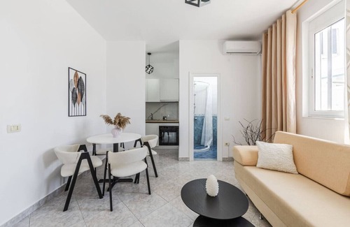 Step into a bright, private retreat just steps from the sparkling shores of Golem. This modern 1-bedroom apartment offers the perfect balance of comfort and convenience, featuring fast WiFi, Air conditioning, a sleek bathroom, and a full kitchen stocked with everything you need. Natural light fills the open-plan layout, designed for rest and recharge. The cozy living space also offers additional sleeping arrangements by request—ideal for couples or small groups.