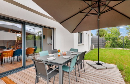 Located on the south coast of the Rhuys peninsula, this lovely new house, designed to accommodate 8 people, welcomes you. Midway between Rouvran beach and Banester beach, it is the ideal place for a seaside holiday, and everything can be done by bicycle.You enter this beautiful 110 m² house through the large open ground floor room, in a TV lounge furnished in a contemporary style, with its comfortable and modern sofa. Then, you discover a beautiful wooden table with a rustic top but modern style, around which 8 cosy and colourful seats invite you to sit down for a good meal. But before treating yourself, you'll need to go through the large brand new kitchen. Very well equipped, you will find a fridge-freezer, an oven, a microwave, a ceramic hob, as well as a dishwasher. For your breakfasts, a Nespresso pod coffee maker, a kettle and a toaster are also at your disposal.This level is completed by a shower room, an independent toilet, and a first bedroom with a Queen size bed (160/200).Upstairs, you will find a bathroom with a bathtub and a second independent toilet. Three bedrooms, each with a Queen size bed, welcome you for a good night's sleep. Two of them have a desk, for teleworking or holiday homework.Another asset of this house is its enclosed garden, which allows children to play peacefully while adults bustle around the plancha to prepare delicious grills, to be enjoyed on the wooden terrace.For added comfort, the house has a washer-dryer, a hairdryer, and a garage that can accommodate bicycles. You can park in front of the garage.Ideally located, the rental is located at:- 800 m from "Rouvran" beach and "Banaster" beach- 800 m from the village and its shops- 1 km from "Carrefour Contact" supermarket- 3 km from "Celt'Aventures" park- 3 km from "L'Escapade cabane à huitres" and "Tro Krêp" restaurants- 6 km from Suscinio Castle- 18 km from Sarzeau Golf Club- 26 km from Vannes train stationA true haven for shore fishing, Tour-du-Parc can be discovered via the coastal path, on foot or by bicycle. This commune of the Gulf of Morbihan is also known for its flagship activity: oyster farming. So in addition to treating yourself, you will discover magnificent views of the Gulf. History enthusiasts can also visit Suscinio Castle, a magnificent historical site located 20 km from Tour-du-Parc, a witness to the medieval past of the region.This rental benefits from a concierge service with a team available throughout the stay for personalised services.This furnished rental has a wi-fi access.This rental does not have access for people with reduced mobility.Animals are not accepted in this rental.The tourist tax is added to the rental amount and must be paid in advance of your stay.REF: Hoomy11953