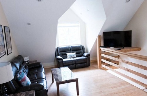 Creekside (our name for this rental) is an inviting two bedroom, two bathroom open living/dining/kitchen space. Guests have remarked that they had everything they needed, including a stack-able washer/drier. It comfortably fits 4 guests but there is a small single bed loft accessed by a built in ladder for a 5th young/spry person, if necessary, bedding included ($45.00 one time charge). The living quarters sit above a three car garage and is surrounded by tall, beautiful pine, birch and chestnut trees. With two bathrooms and two bedrooms plus a fully equipped kitchen it has all you need for your home away from home. You can see wildlife from the back porch and enjoy the shade of the beautiful trees when you return from a day of sightseeing or adventure. It is tucked away in a wooded area, with Woodland creek running behind it. This creek is shallow and on the other side of our yard fence. Sitting on the deck in the evening while cooking on the gas grill is an extra treat. Although it feels like you are miles away from town, Creekside is in fact walking distance to downtown Kalispell for fine dining, shopping, spas, cafe's, Kalispell Center Mall, churches, museums, Woodland Park is less than a block away. It is the home of many gardens and a lovely ponds, Ice Skating in the winter, Waterpark and swimming pool in the summer plus a skate park and running/walking paths. Softballs fields and the famous historic Conrad Mansion are also in the neighborhood. We also rent a larger house up the hill called Park Place- together the two places make a perfect spot for family reunions. Well behaved pets are welcome ($75/stay), please see Pet Policy for more details. Though there is a fence around the yard it is not necessarily designed to contain pets. Guests will need to make other arrangements for pets. There is a one car garage space available for our guests below the Creekside rental.