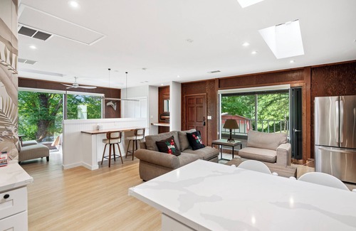 Step into the inviting living room, where stylish decor meets comfortable furnishings. The sofa provides the perfect spot to unwind after a day of Georgia sightseeing. Large picture windows and unique skylights allow natural light to flood the space, creating a warm and welcoming atmosphere.