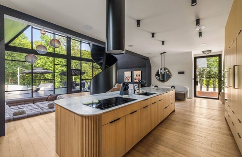 From the moment you arrive, you’ll feel the shift. Set against a wooded backdrop with sweeping views of the water, the home’s bold exterior gives way to bright, open interiors that blur the line between indoors and out. At the heart of the home is a sunken conversation pit—a rare architectural feature that invites connection, laughter, and slow mornings with a view.
