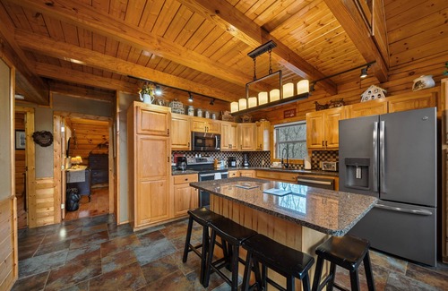 Spanning three levels, this spacious and inviting log cabin exudes rustic mountain charm with rich wood accents throughout. The main floor living room is a cozy retreat, featuring a wall of windows that flood the space with natural light, leather furniture arranged around a wood-burning fireplace, and a warm ambiance perfect for gatherings. The fully equipped kitchen boasts all stainless steel appliances, a large island, and ample space for preparing family meals. The dining table comfortably seats a full house, making it easy to enjoy meals together before heading out to explore.