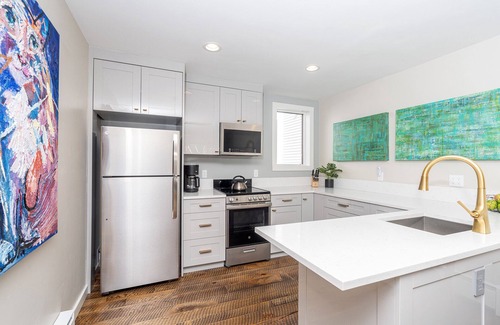 The kitchen offers a small dishwasher, stove/oven, a full-size refrigerator and tons of counter space. Open to the living area, the kitchen overlooks a dining table that's perfect for enjoying a home-cooked meal (or working if you must!). The dining table backs the large and comfortable couch offering you a place to sit back and stretch your legs after a long day on the mountain. You'll pass the completely renovated bathroom on your way to the bedrooms -- on the north side a king bedroom with a flat screen TV and on the south side a split king bedroom, perfect as a king bed or also for the kiddos as two twin beds.