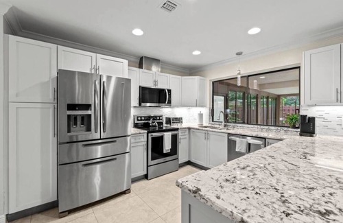 Our 4 bedroom, 2.5 bath property is recently remodeled, spacious and impeccable throughout. Whether you're looking to make meals for the whole family in our elegant fully-equipped kitchen, relax in our comfortable living room with a bar area, enjoy the indoor/outdoor "Florida Room" or unwind from a long day on our furnished outdoor patio, you'll find comfort and serenity over your entire stay.