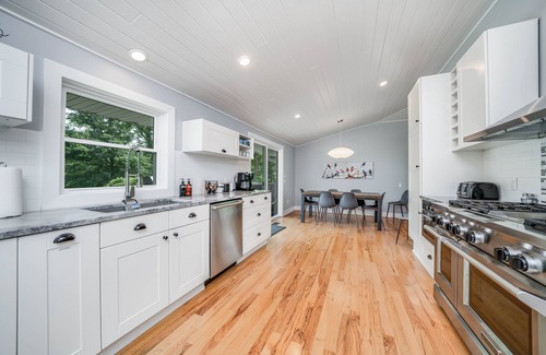 When you're back from the lake and ready for a snack, head to the beautifully-designed, modern kitchen. It's fully equipped with state-of-the-art stainless steel appliances, tons of storage for your groceries, and ample counter space for meal prep. Brew a single cup or full pot of coffee, use the 6-burner stove for your culinary creations, and enjoy views of greenery in the private backyard while you're washing the dishes. Have a casual meal at the built-in breakfast nook, or host a more formal affair at the dining table with seating for eight.