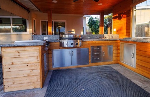 Good for large groups.Spacious living room. Large backyard with beautiful patio and outdoor kitchen and outdoor shower. Lot of parking space even for big vehicles. Upscale amenities like electric fireplace, electric sunshades for the patio, touchless light for mirror. Drinking water fountain upstairs.