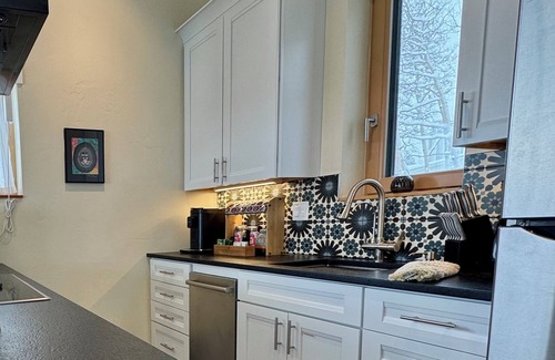 Perched high above the Mt Crested Butte ski area, with breathtaking views, this guesthouse is the perfect vacation spot for an incredible winter trip. Completed in 2022, the lower level of our house has a beautiful walk-out patio with fire pit, sofas, grill and private six person hot tub. The living room has comfortable seating to view your favorite shows on the 55" smart TV. This high-tech, modern house has in-floor radiant heat, dimmable lighting, and a whole house ventilator that provides continuous, warm humidified fresh mountain air. Full sized washer and dryer are conveniently located right outside the bedrooms. The fully-equipped modern kitchenette has a precise induction cooktop, complete coffee/tea station, air fryer, microwave and dishwasher. Four comfortable stools on the cooktop peninsula make dining-in a pleasure. Watch the sun set after a long day of skiing from the king sized bed in the master suite. The second bedroom has an amazing accent wall fully lit with led string lights. A large double vanity bathroom with a rain shower is located next to the second bedroom. A very comfortable Italian sleeper sofa (queen size) with mountain views is located in the living room. For convenience, store your gear in a shared, heated mud room at driveway level. . There is driveway parking for 2 cars.
