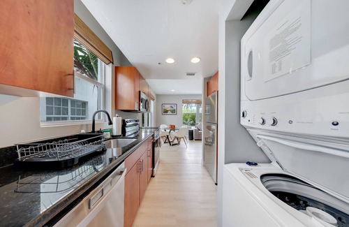 Inside: washer/dryer, full kitchen, 65” Smart TV, fast Wi-Fi, balcony, and all your beach gear. Outside: a gated Art Deco oasis with secure keypad entry, heated pool, BBQ, bike racks, and a lush tropical courtyard. All on a quiet, residential block—yet steps to Ocean Drive, Lincoln Road, playgrounds, museums, shops, and SoBe’s iconic dining and nightlife.
