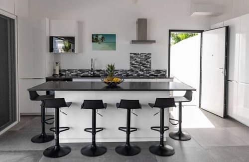 The interior of this immaculate three-bedroom three-bathroom villa is a simple whitewash with stately driftwood-gray and sleek black modern lines in the kitchen, which is directly adjacent to the main living space. The main living room is decorated with mirrors in black trim, a three-panel graphic of a cresting wave, and a clock built from a ship’s captain wheel. The kitchen is barely noticeable, as modern-minimalist as it is, except for the bar stools that invite conversation with friends or perhaps in-house cooks in the event guests prefer a catered evening in. Both rooms open up onto the pool terrace where alfresco dining, a poolside lounge, and sunbathing chairs offer ample seating throughout the day for every occasion to appreciate the azure-blue waters below.